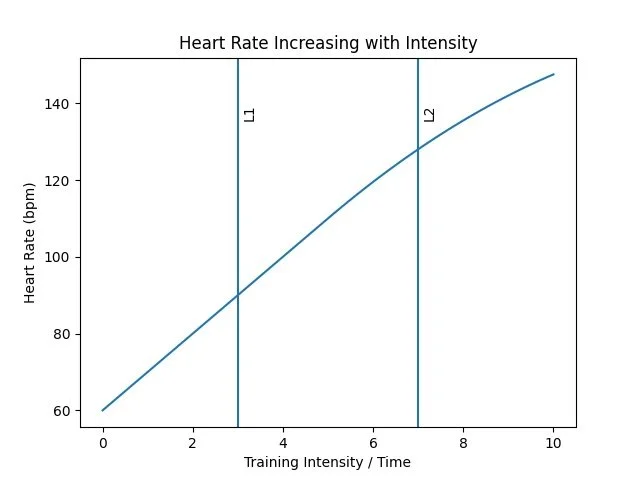 Here is a simple diagram illustrating how heart rate typically increases with exercise intensity or time, with approximate points for the first lactate threshold (L1) and the second lactate threshold (L2):